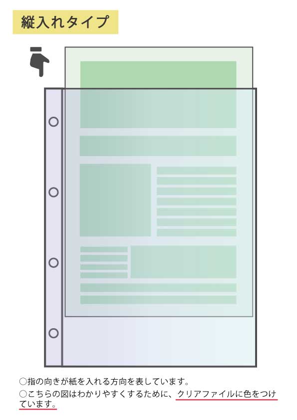 ポケットの差込口は上からのものと横からのものがあります。比較的重いものを収納したい場合は、差込口が横になっているものを選び、ファインダーにとじた後もなるべくファインダーごと横置きするのがおすすめです。