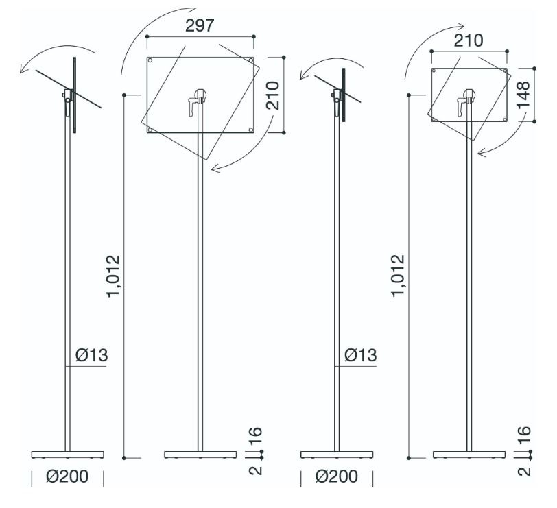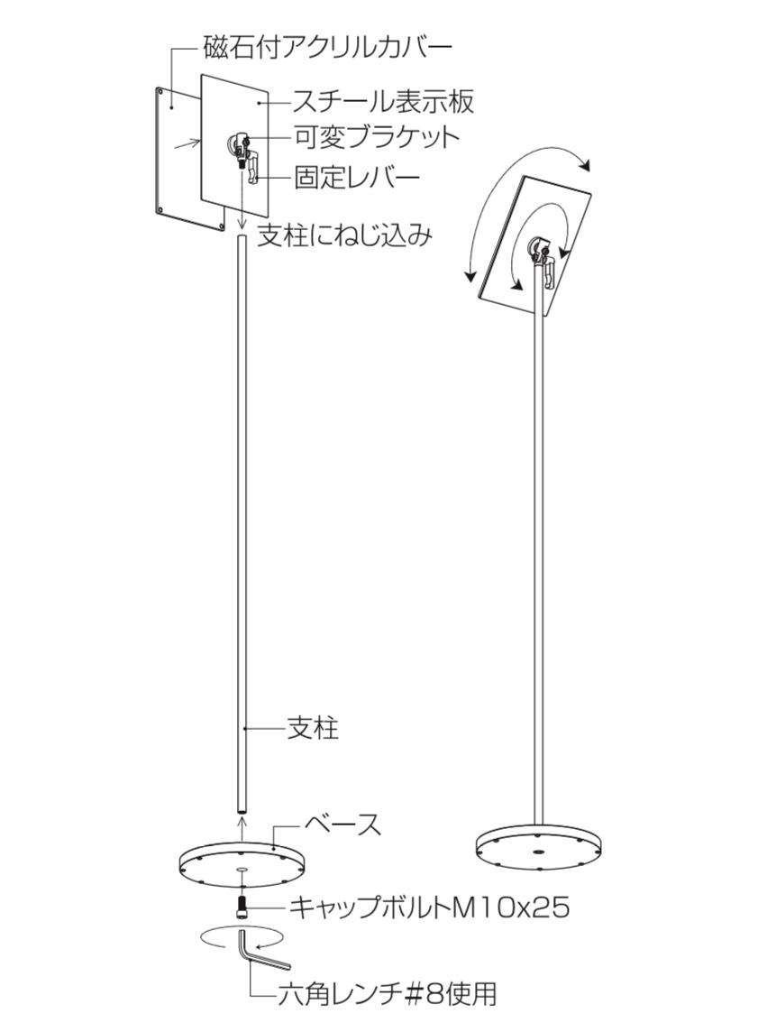 スチール表示板は可変でき、傾斜角度や縦横の方向を工具なしで自由に変えることができます。
